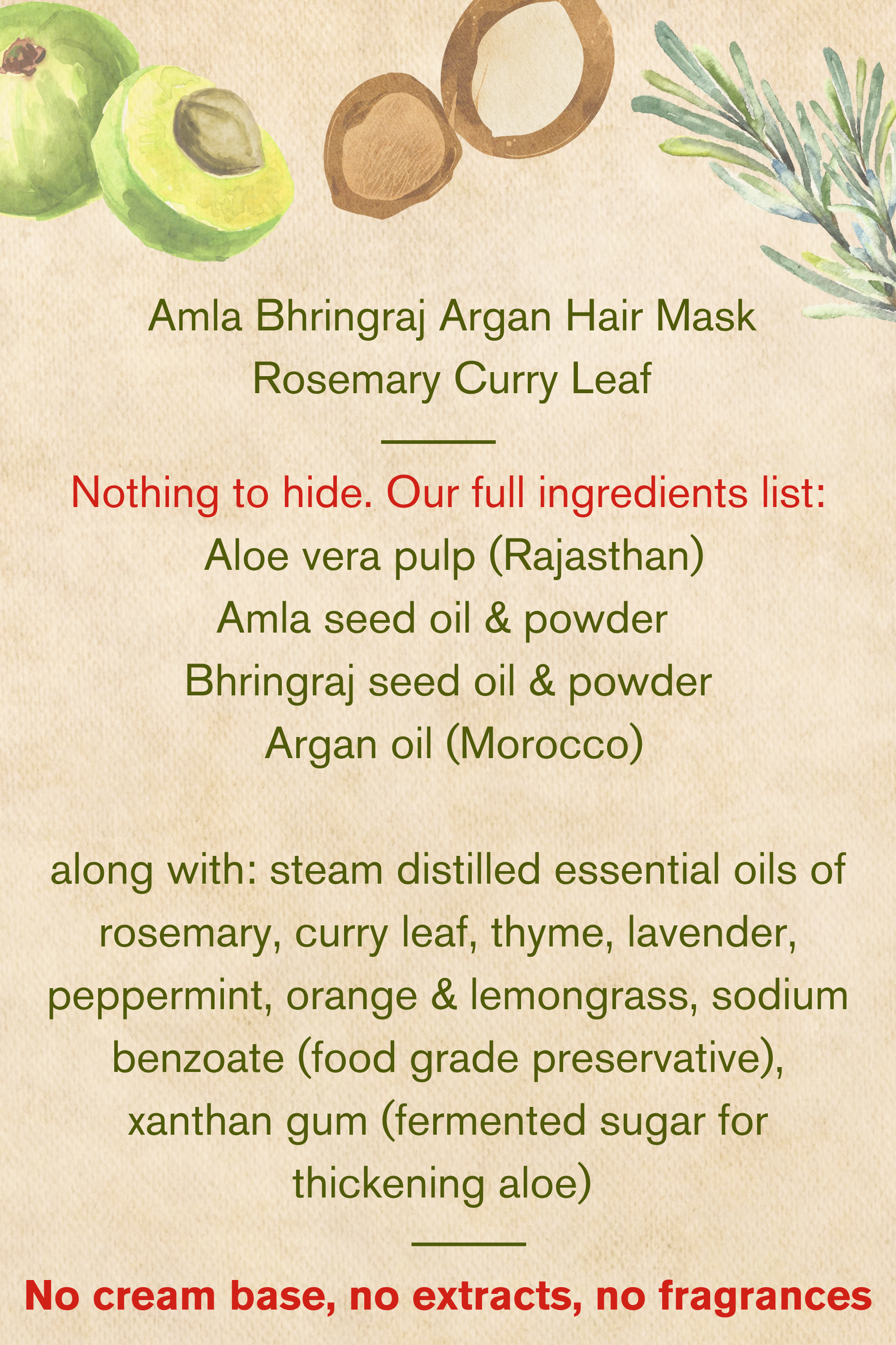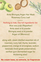 IngredientsAloe vera pulp (Rajasthan), amla seed oil & powder, bhringraj seed oil & powder, argan oil (Morocco), steam distilled essential oils of rosemary, curry leaf, thyme, lavender, peppermint, orange & lemongrass, sodium benzoate (food grade preservative), xanthan gum (fermented sugar for thickening aloe) |