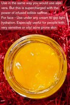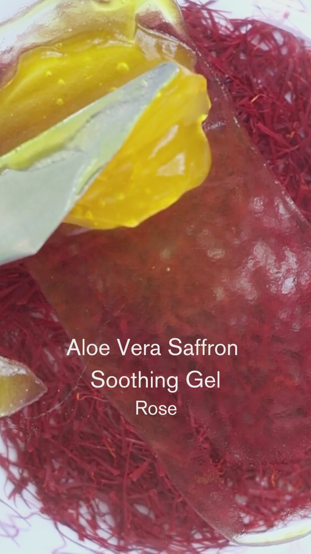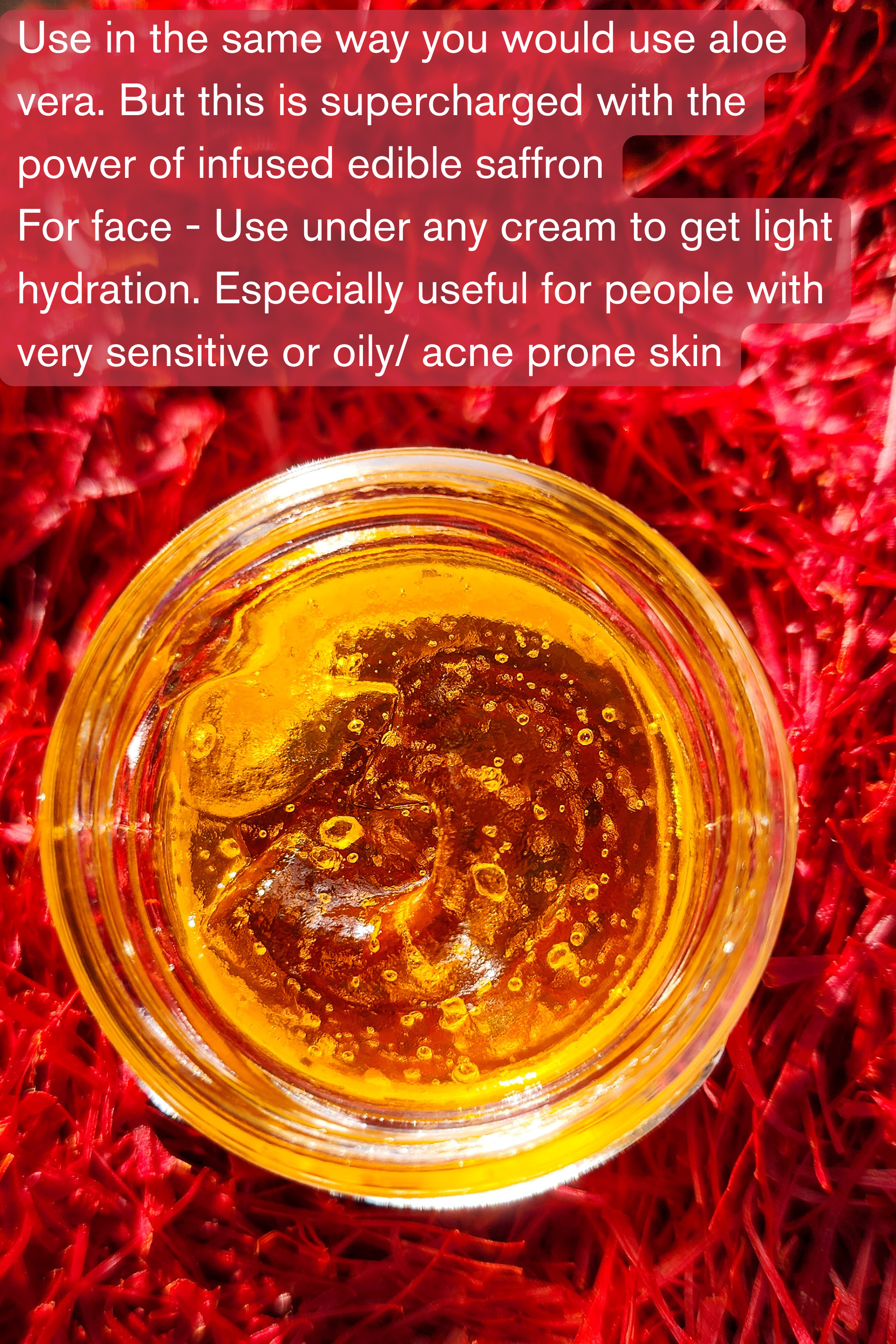 • Made by infusing real edible saffron in aloe vera for 3 days. The saffron is then removed & the soothing gel is ready