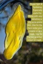 All natural multipurpose aloe vera infused with edible saffron. It can be used on the face, body, or hair in the same way you would use regular aloe vera. For the face or body, use it under a cream to give the skin a dose of natural vitamin C. Can also be used as a light mask or cleanser. For the hair, use it as a leave on hair cream, a hair mask, or even on the scalp.