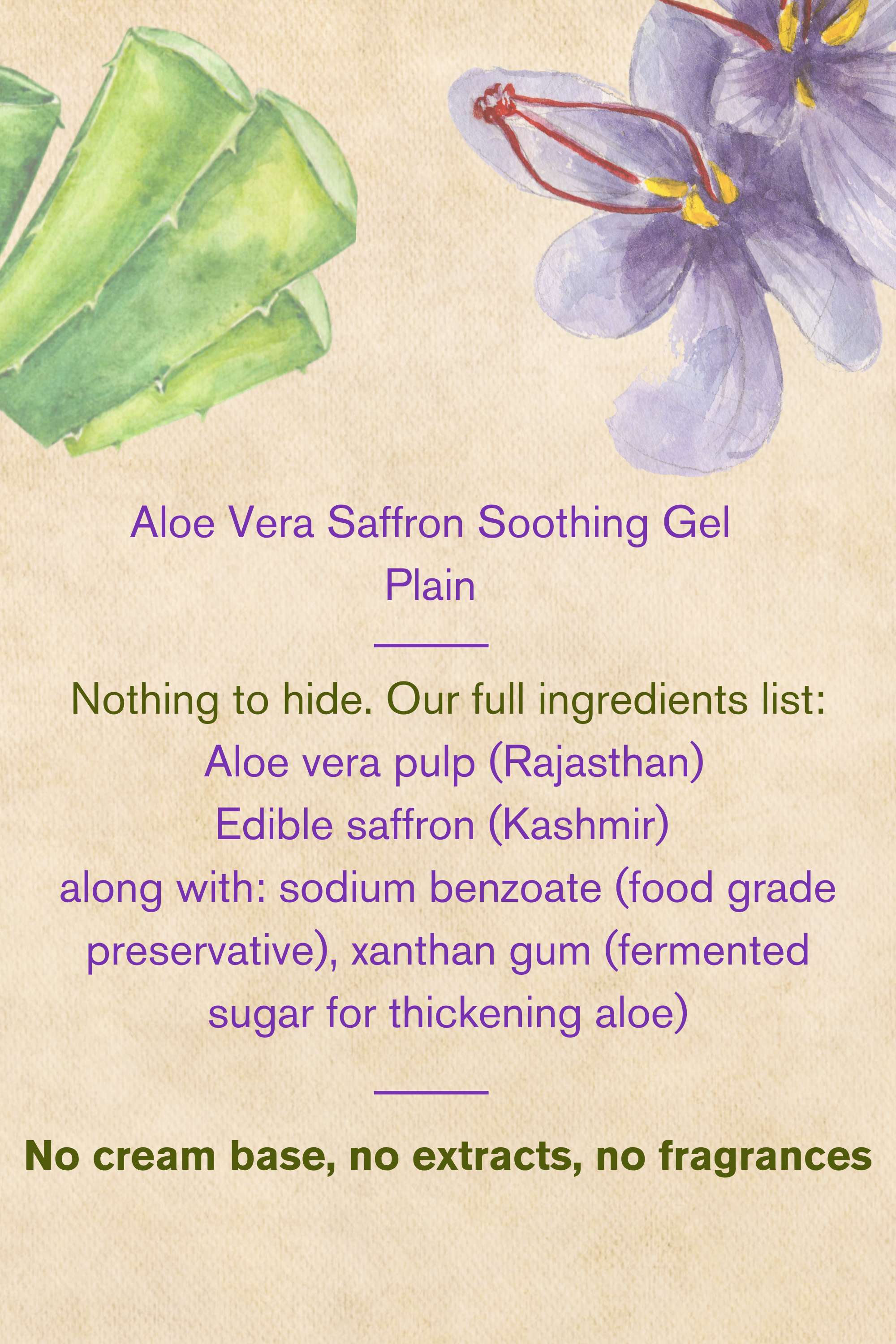 • Aloe Vera Saffron Soothing Gel Plain - Aloe vera pulp (Rajasthan), real edible saffron (Kashmir), sodium benzoate (food grade preservative), xanthan gum (fermented sugar for thickening aloe vera)