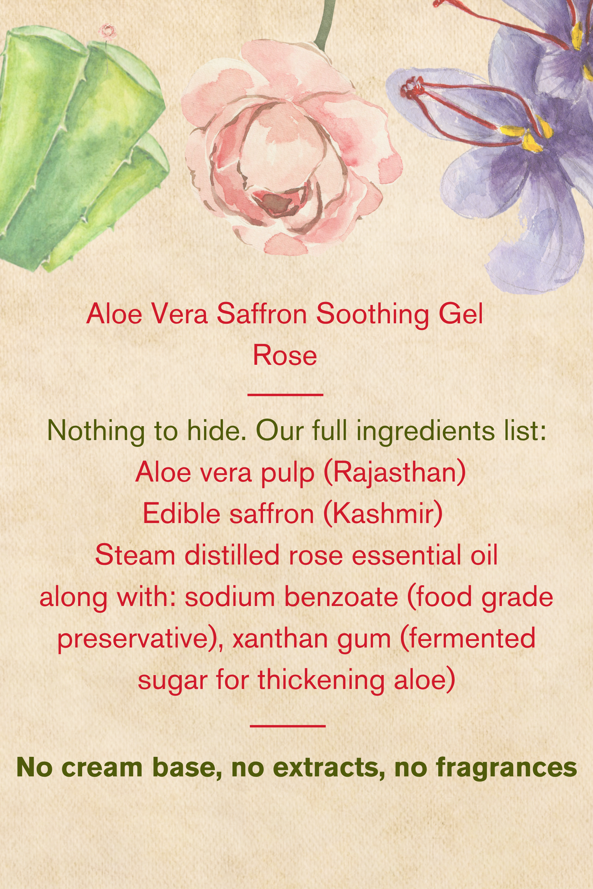 • Aloe Vera Saffron Soothing Gel Rose - Aloe vera pulp (Rajasthan), real edible saffron (Kashmir), steam distilled rose essential oil, sodium benzoate (food grade preservative), xanthan gum (fermented sugar for thickening aloe vera)