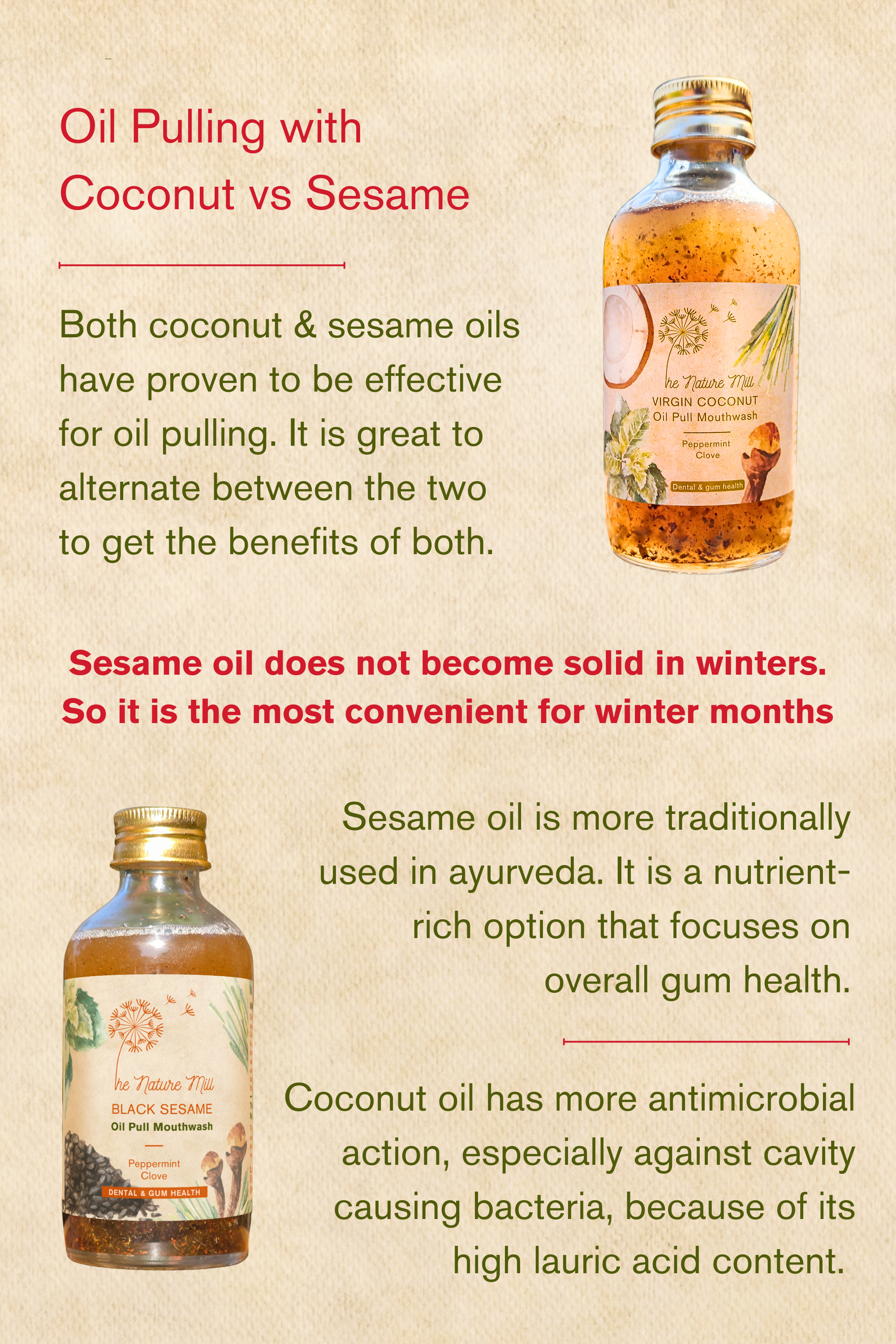 How it worksOil pulling has been recommended by ayurveda for ages. While oil pulling is generally done with virgin coconut oil, we have enhanced it by adding ground peppermint & cloves, & essential oils to give it the feel for freshness.
