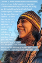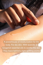 IngredientsRaw shea butter (Ghana), virgin coconut oil (Tamil Nadu), apricot oil (Himachal), steam distilled essential oils of lavender, bergamot, & orange |