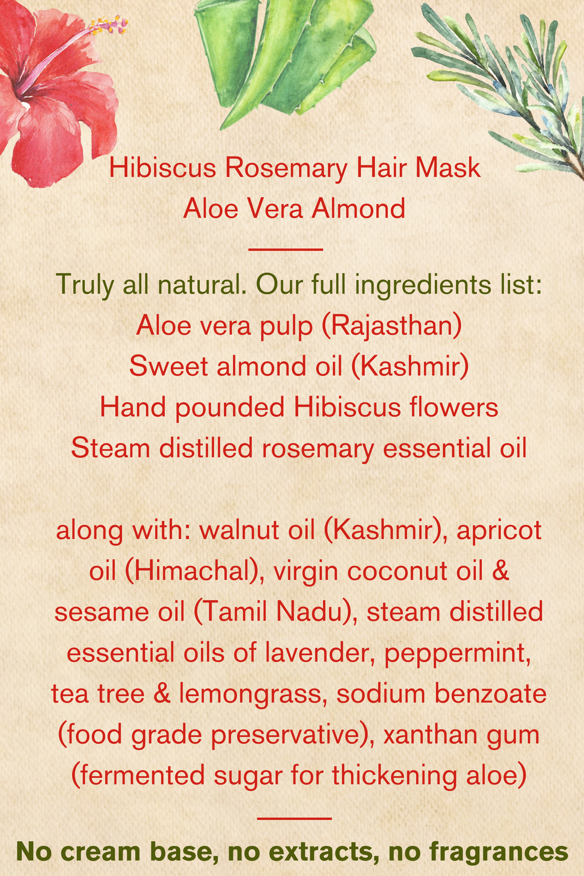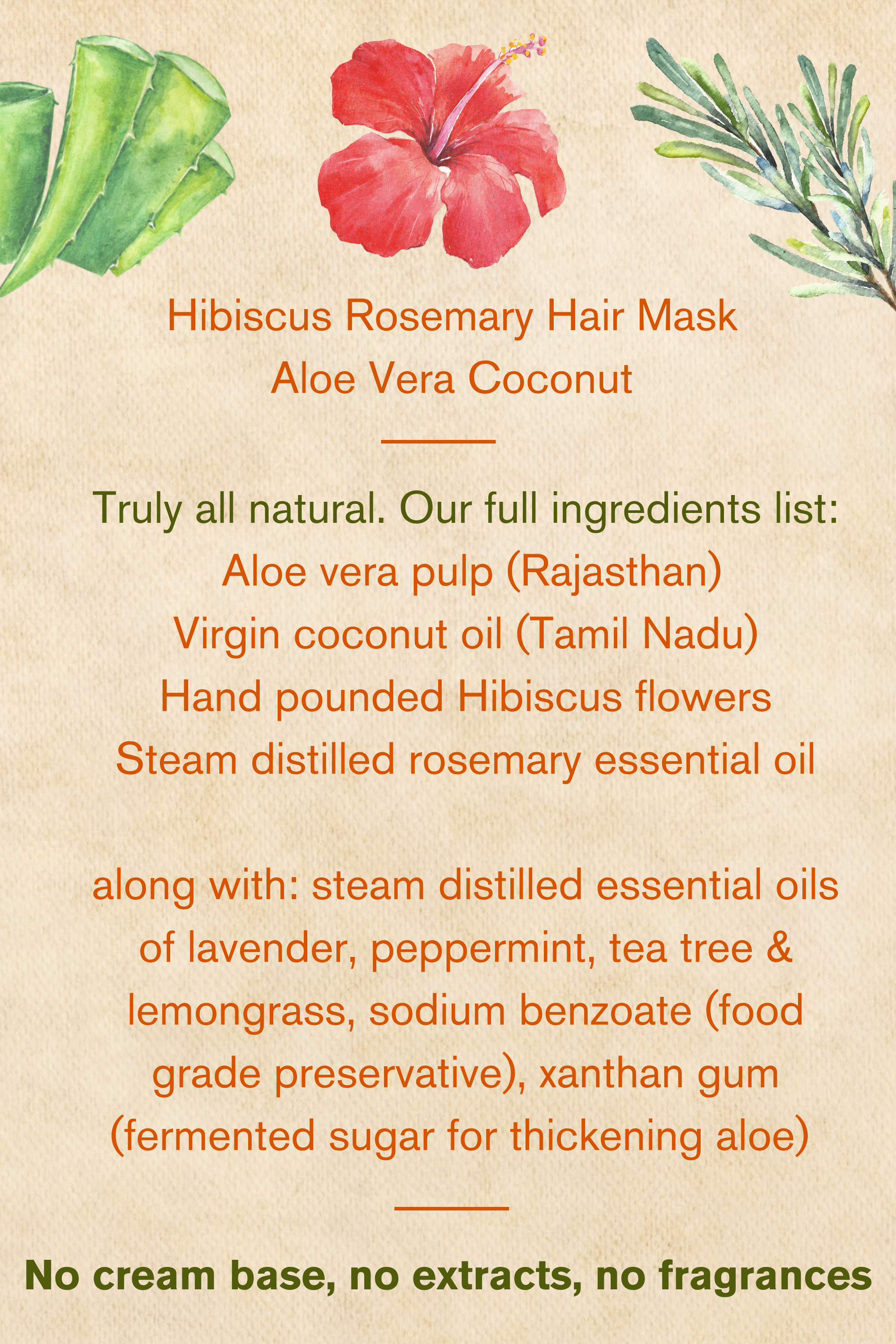All natural hair mask bringing together the power of Hibiscus flowers with steam distilled rosemary essential oil. For repairing the texture of the hair. 100g jar