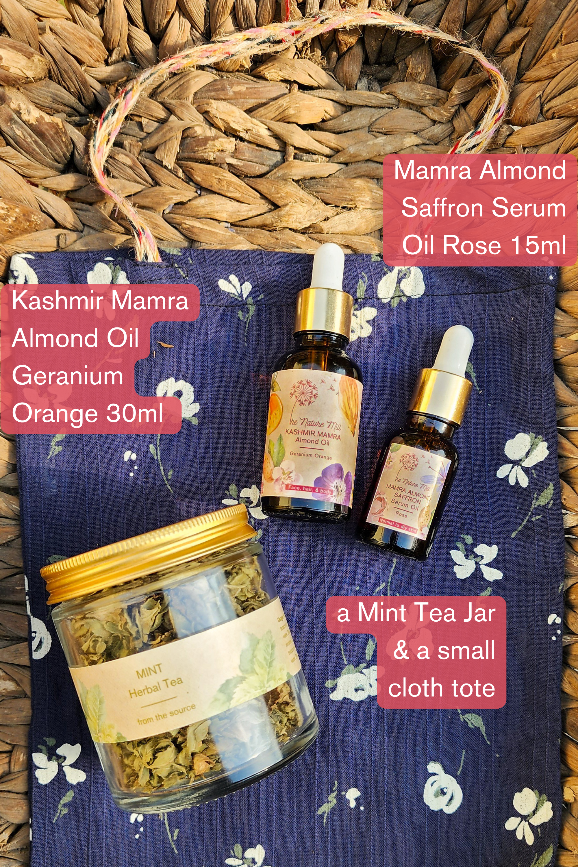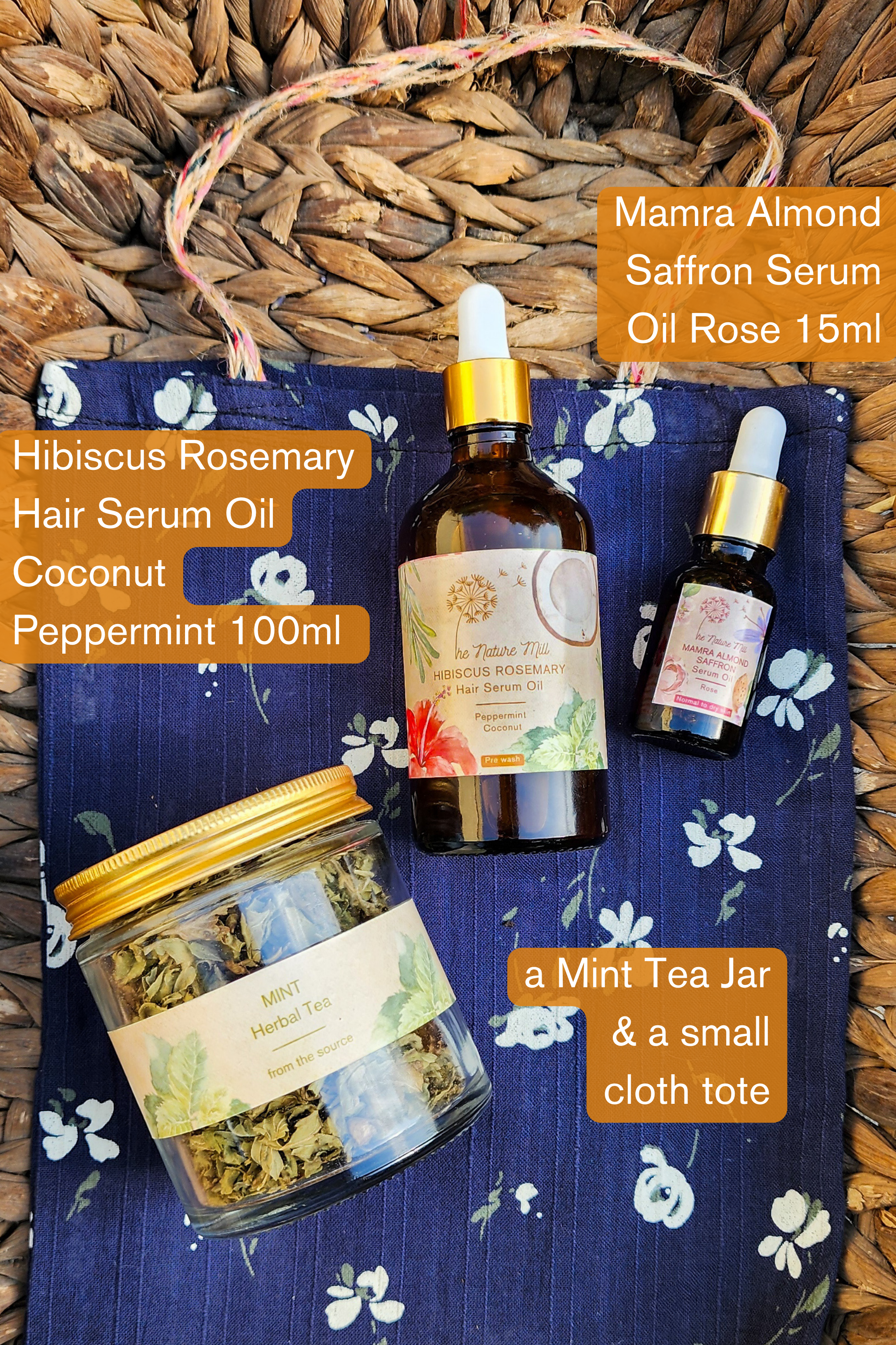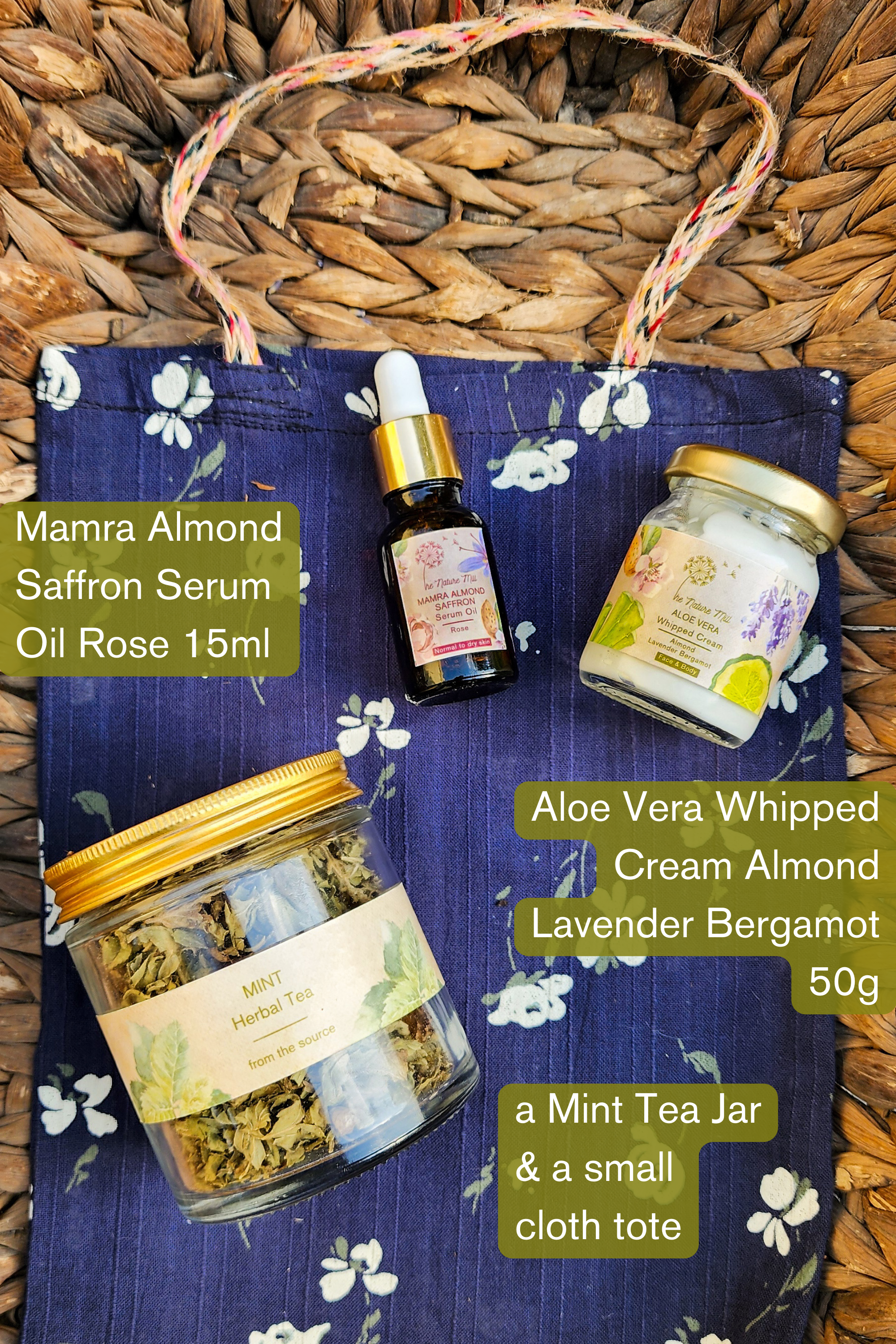 A gift set that has 2 wonderful products of ours, along with a jar of mint tea and a small tote bag. A range of options of which product of ours you can include in your set.