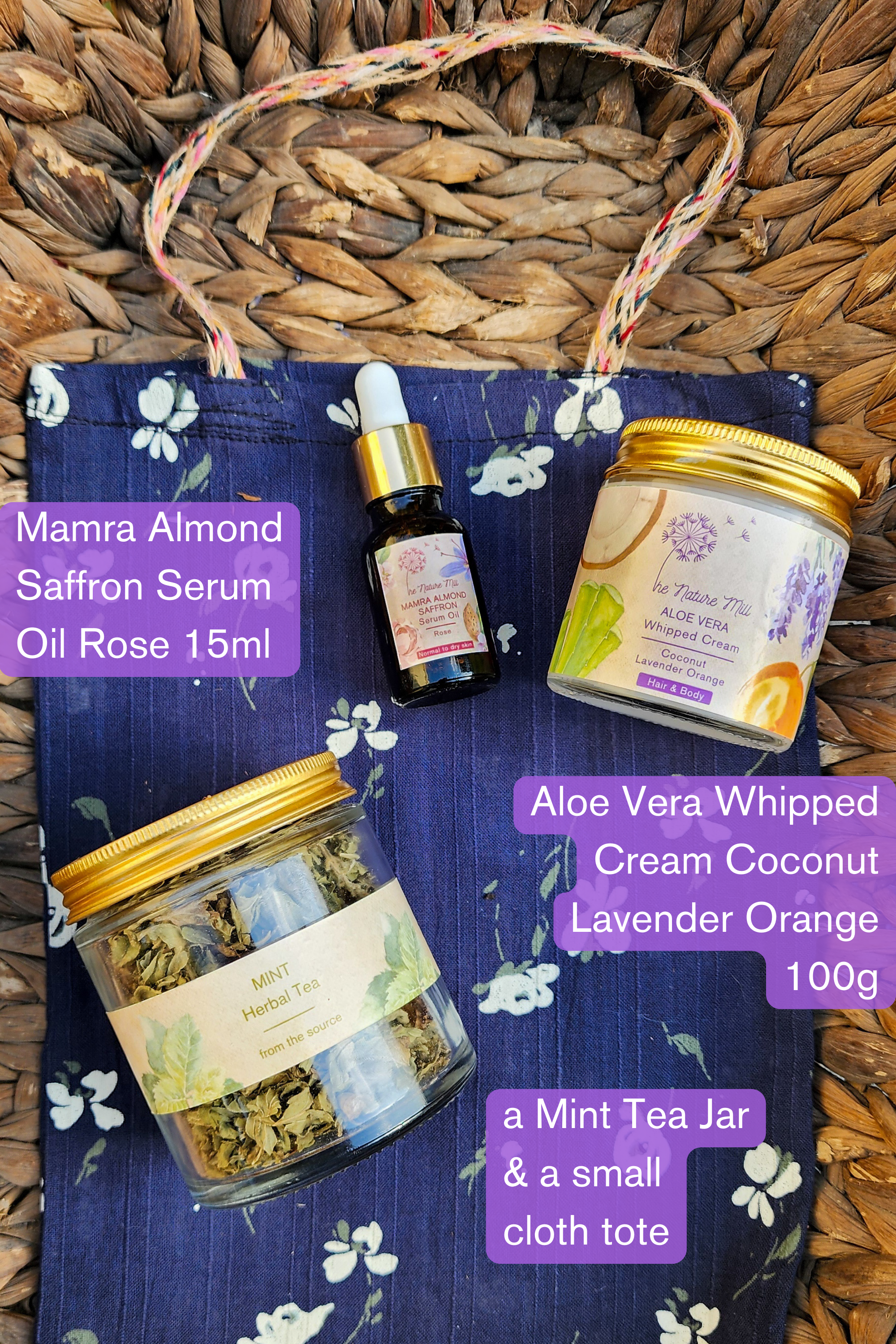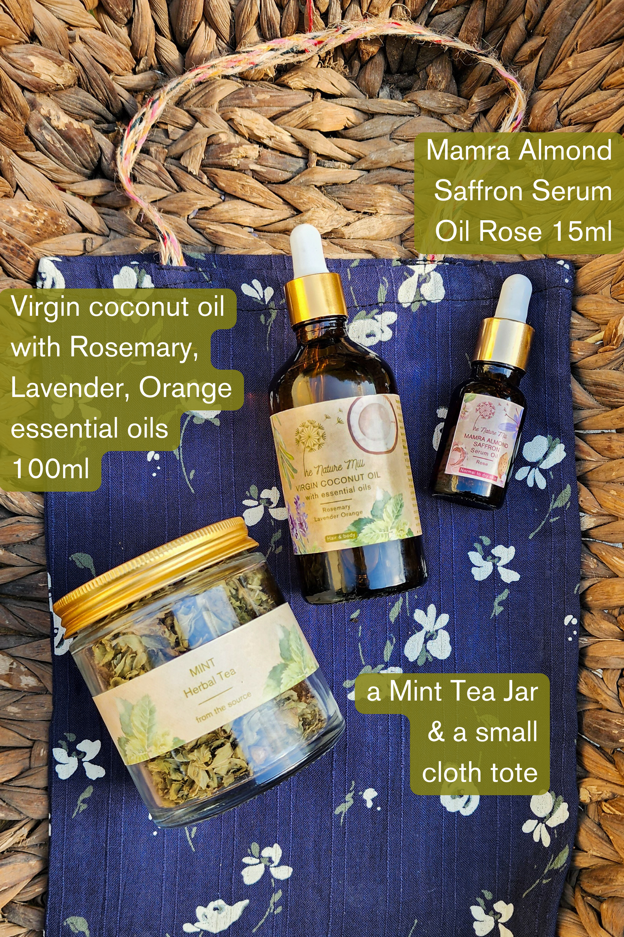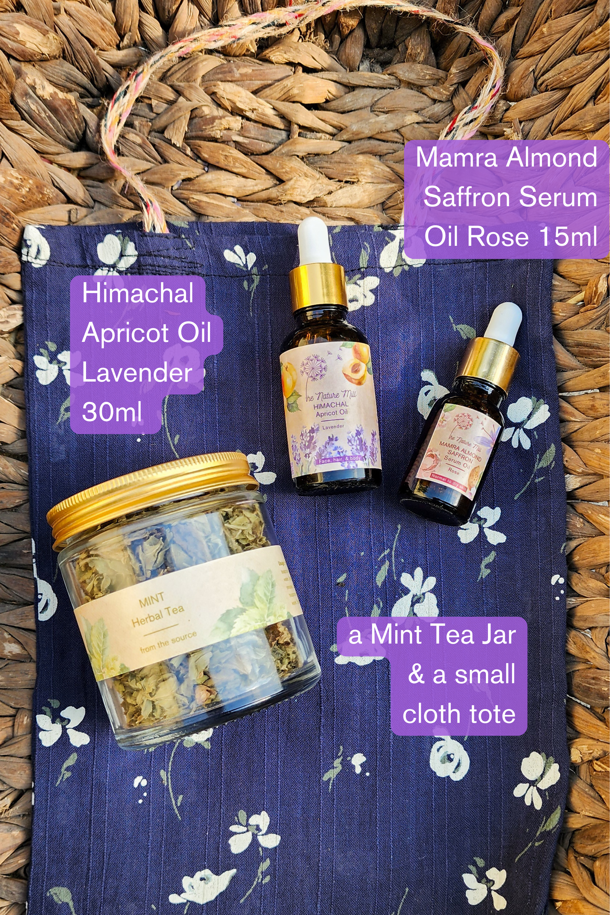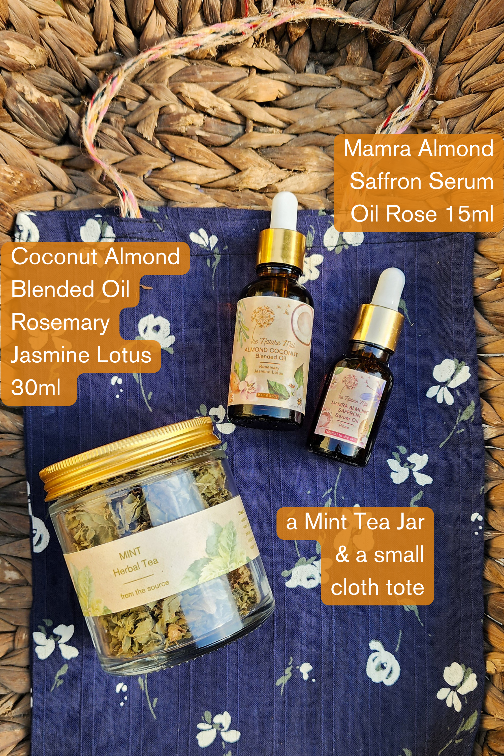 A gift set that has 2 wonderful products of ours, along with a jar of mint tea and a small tote bag. A range of options of which product of ours you can include in your set.
